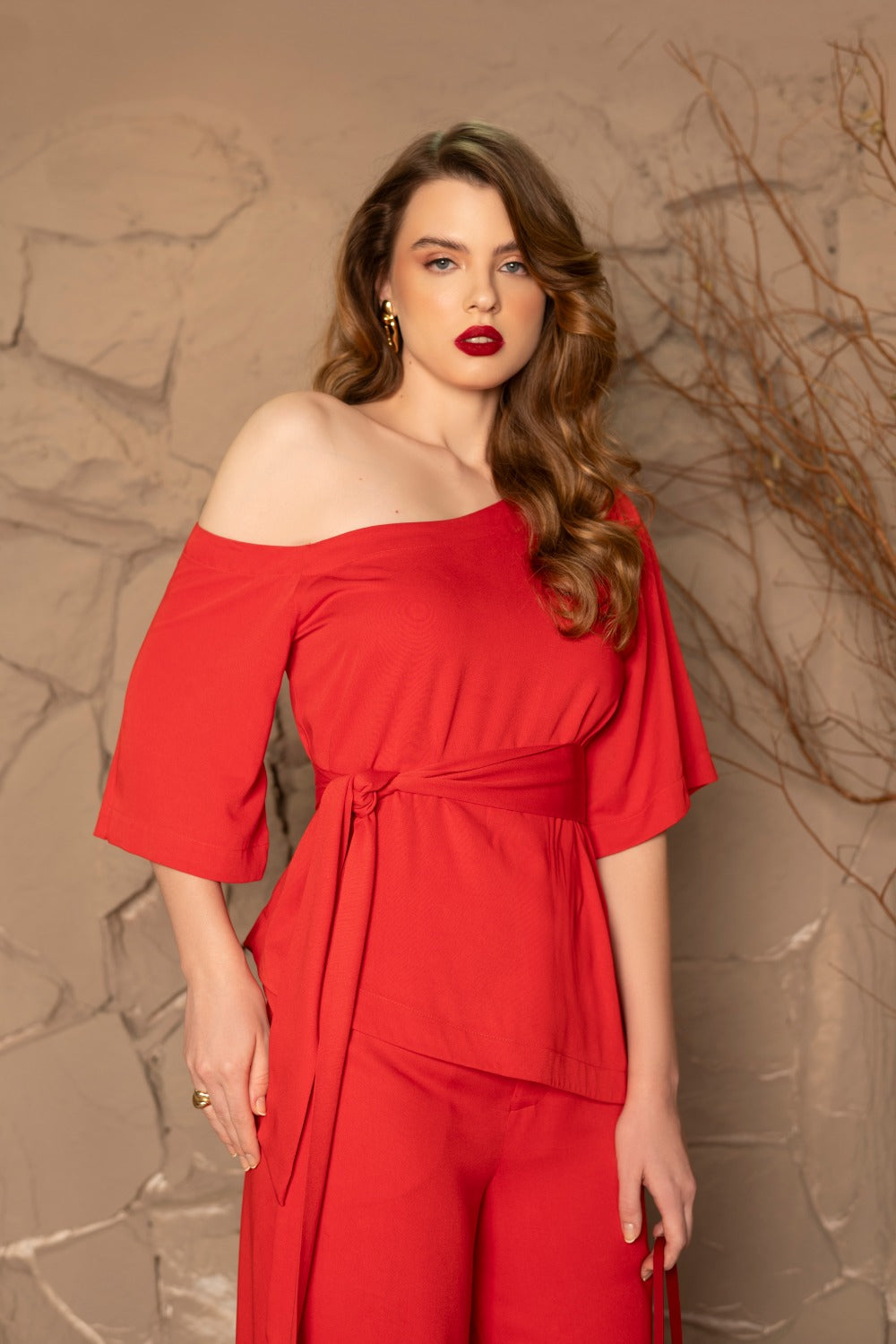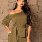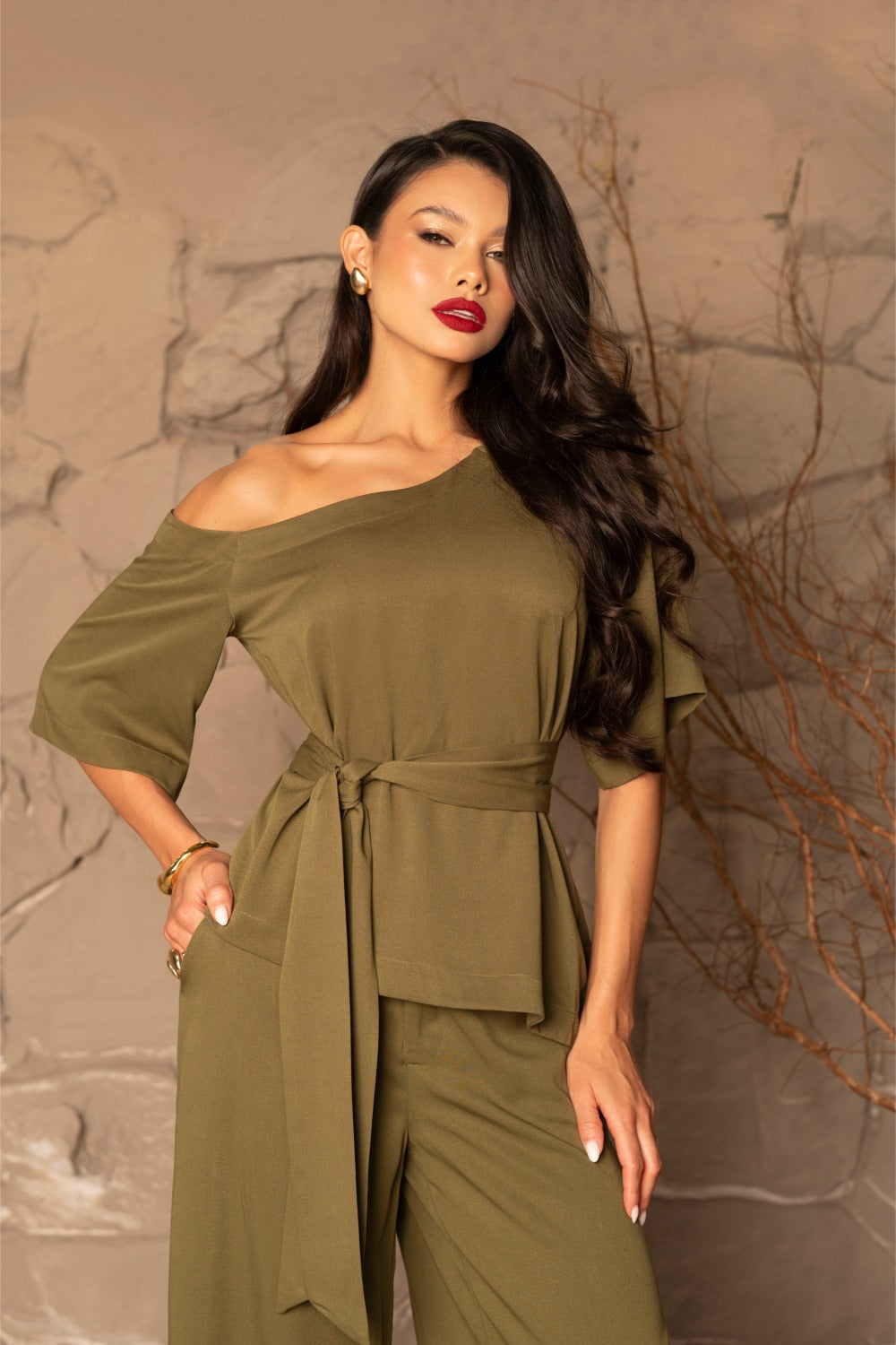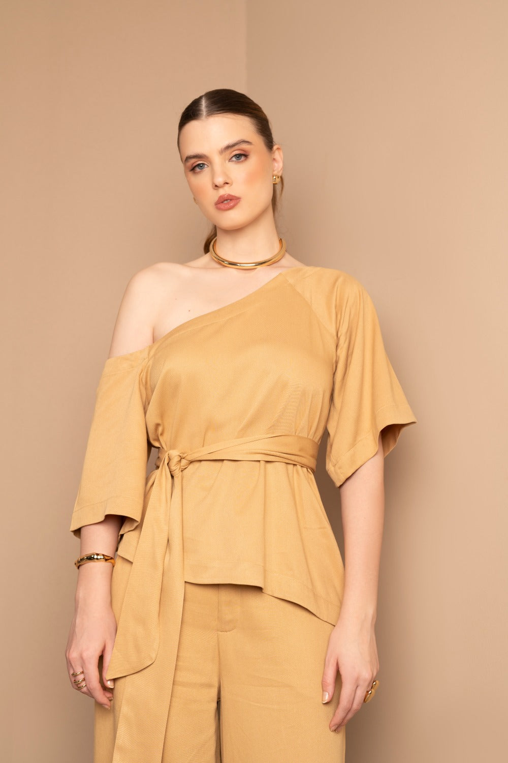 Confeccionada em rayon twill ela oferece um caimento leve e fluido. O corte assimétrico com uma leve exposição dos ombros traz um charme moderno. Acompanha uma faixa versátil que pode ser usada de diversas formas.