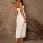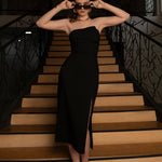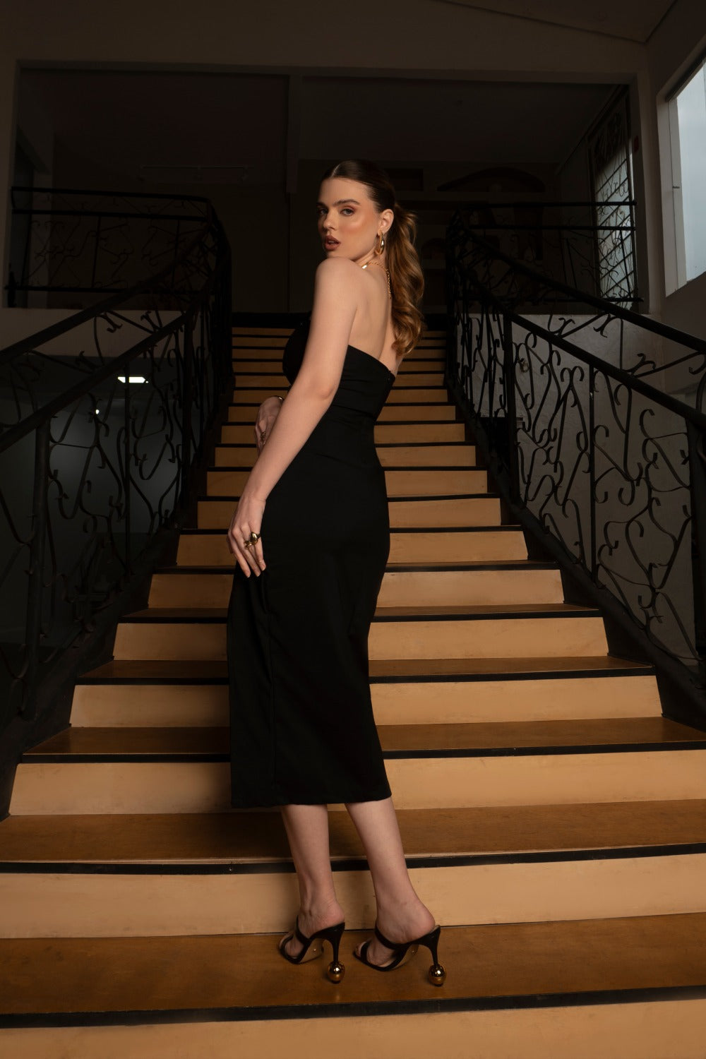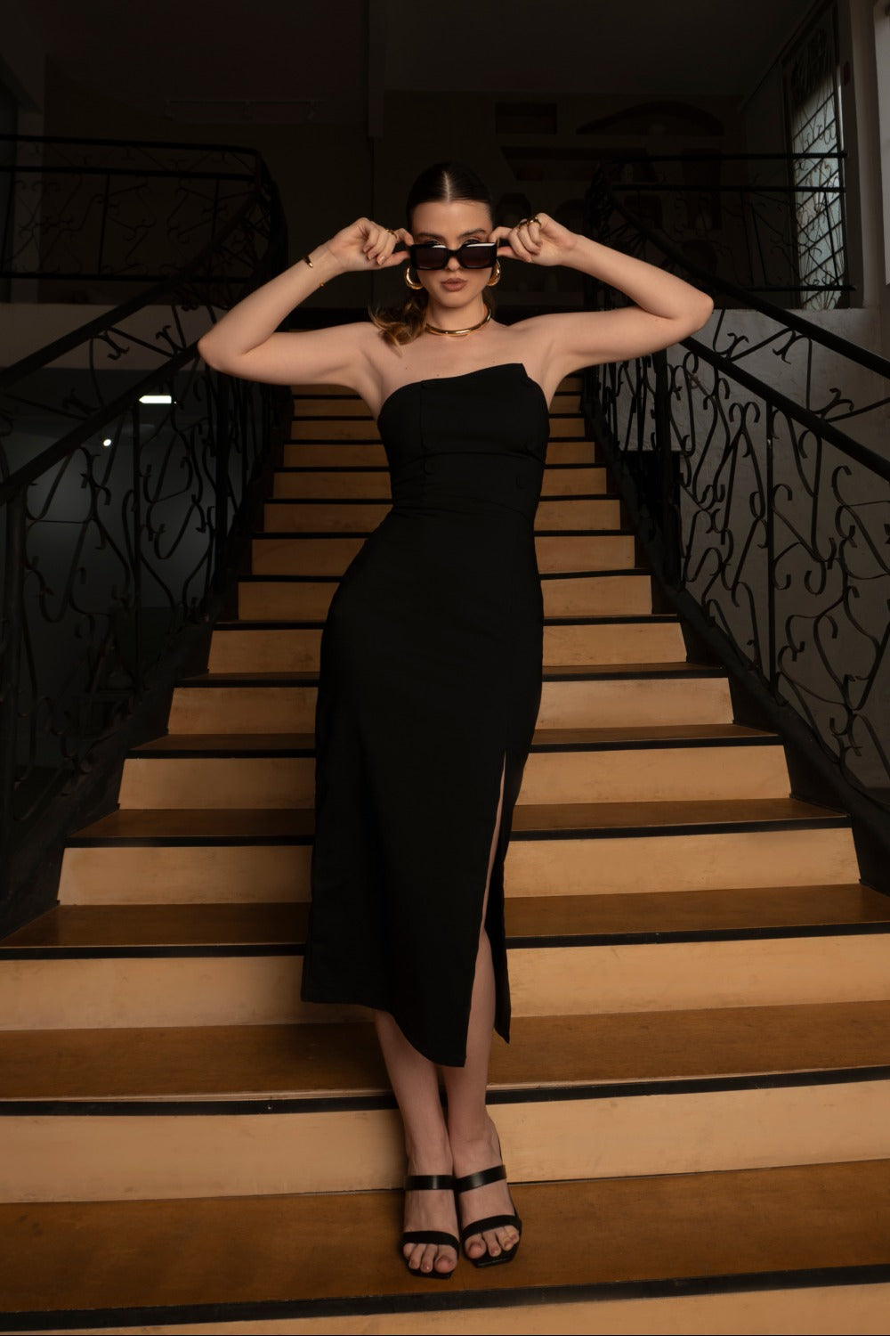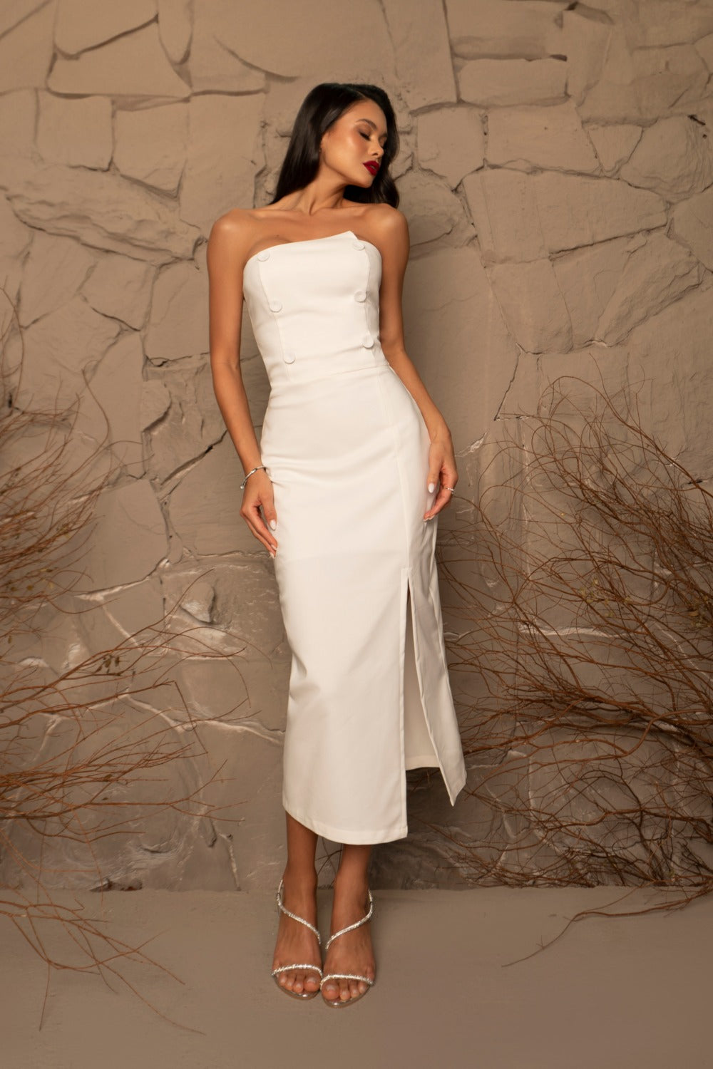 Ideal para ocasiões especiais, sua modelagem tomara que caia valoriza o colo, enquanto os botões frontais e a fenda sutil trazem um charme extra e modernidade à peça. Aposte em acessórios marcantes para destacar ainda mais a produção.
